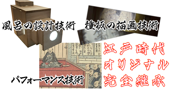 - 「江戸写し絵」のオリジナルを復活させる試みは極めて困難です。残された資料に少なさと、明治以降の「近代的改悪」により、三笑亭都楽時代の風呂や種板の構造や設計、デザインは残っていません。残された僅かな資料や情報を、パズルのように当てはめながら、その実態を探ってゆくという膨大な作業となります。